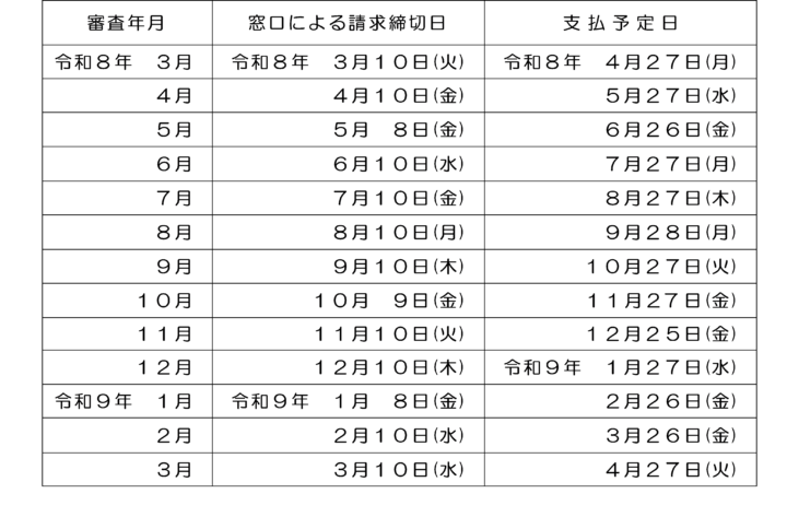 令和8年度の介護報酬請求締切年月日と支払予定年月日は以下のとおりです。
