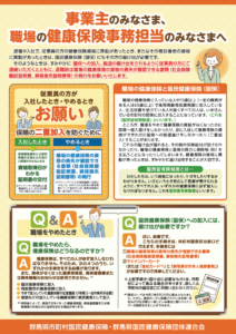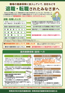 社会保険離脱者を対象に国民健康保険資格取得の早期届出を促すとともにその重要性を周知することを目的に「社保離脱者届出遅延防止対策用チラシ」を作成し、各市町村、県内年金事務所、健康保険組合及び県内ハローワーク等に配布しています。